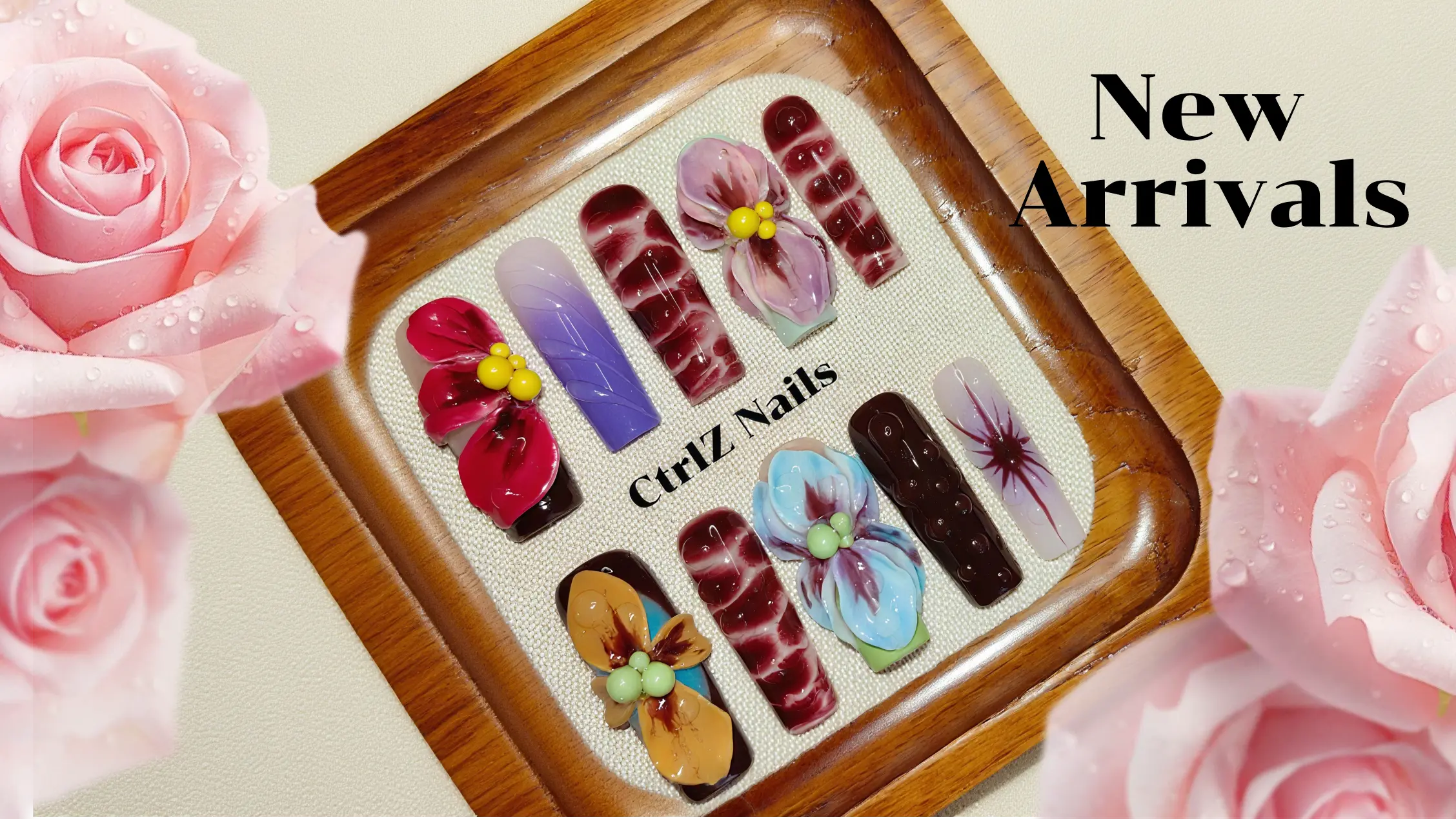 3D Floral Press On Nails - Hand Carved Botanical Design Handmade Fake Nails