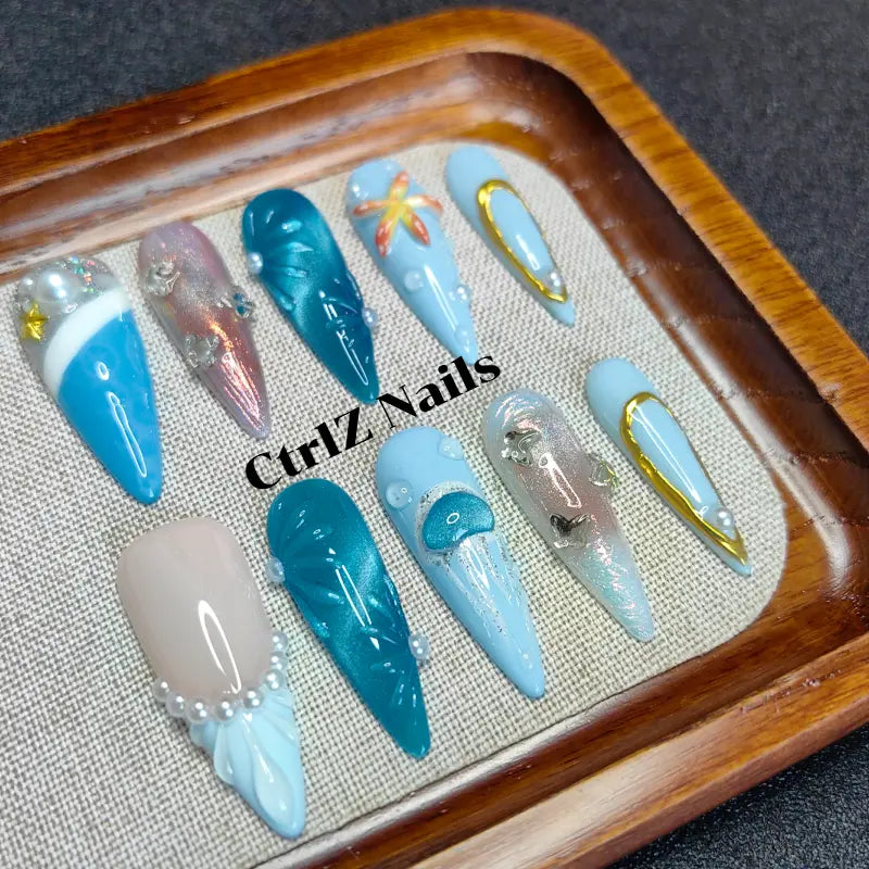 Abyssal Dream Fake Nails - Ocean Fantasy Pearl & Shell Design Handmade Fake Nails
